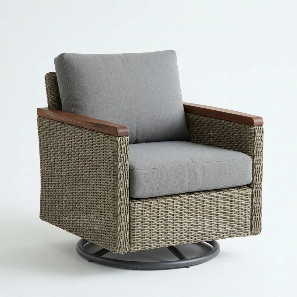 Drehbarer Relaxsessel in Rattanoptik mit Akazienholz-Armlehnen und grauen Bezügen