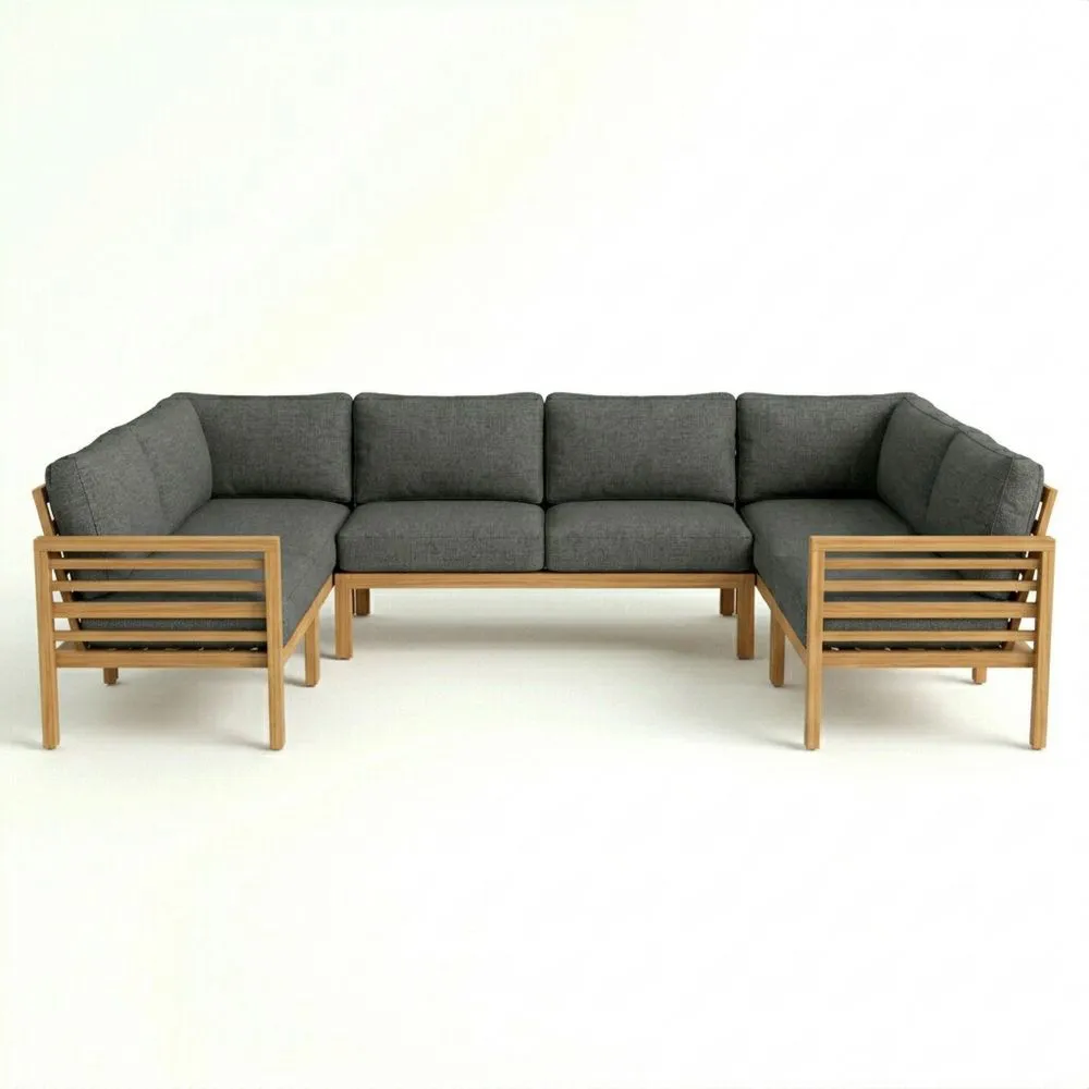 Eck-Gartensofa aus Teakholz mit dunkelgrauen Kissen, für den Außenbereich