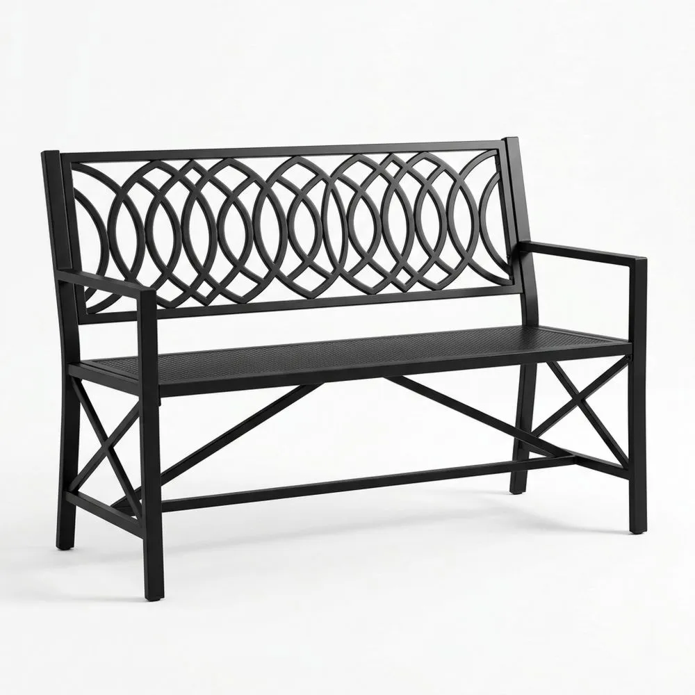 Gartenbank aus Stahl mit dekorativer Rückenlehne, Schwarz, Länge 128 cm