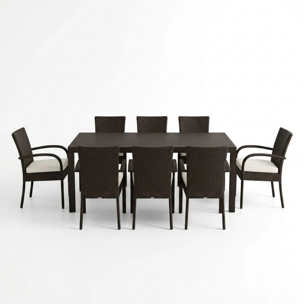 Produkte im Set: 1 Tisch, 8 Stühle, 8 Sitzkissen.