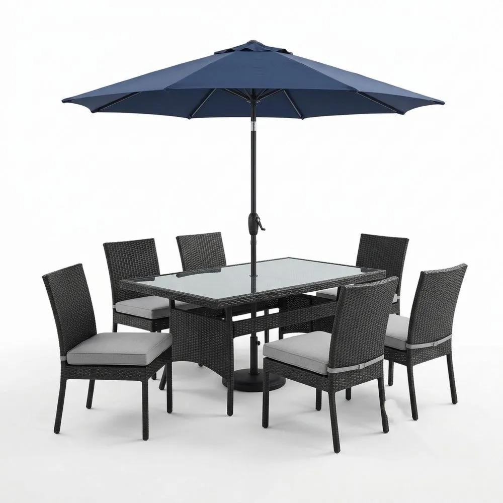 Garten-Essmöbel-Set mit Glastisch und Sonnenschirm