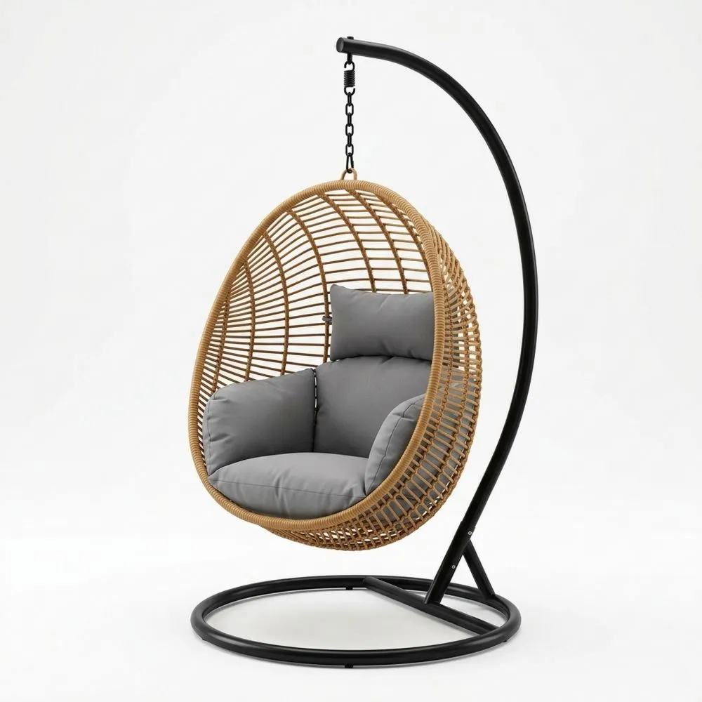 Der Hängesessel besteht aus einem Stahlrahmen und ist mit naturfarbenem Rattan geflochten. Die grauen Kissen bestehen aus Polyester und bieten eine Sitzfläche. Der Sessel hat eine Höhe von 200 cm und einen Durchmesser von 95 cm. Die maximale Tragfähigkeit beträgt 120 kg. Mit Kopfkissen.