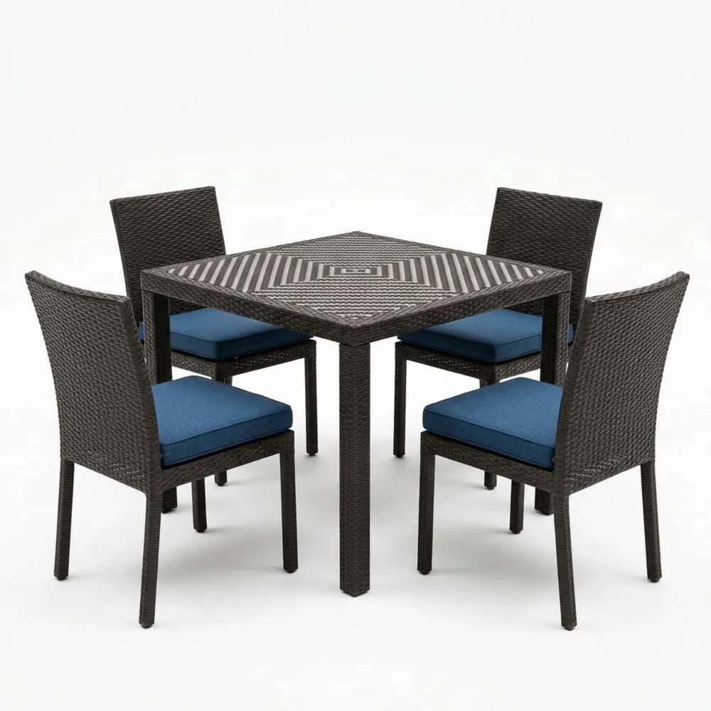 Polyrattan-Garten-Essmöbel-Set mit Tisch und 4 Stühlen, Dunkelbraun/Blau