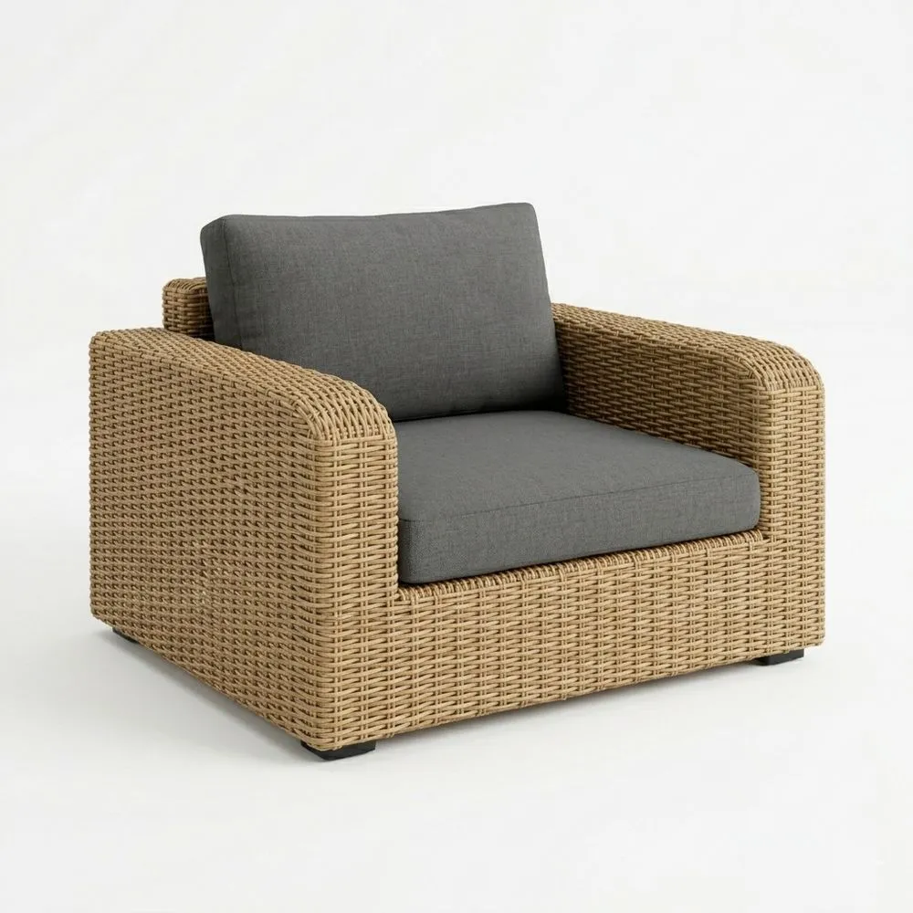 Relaxstuhl aus Polyrattan, Beige, mit dunkelgrauem Kissen