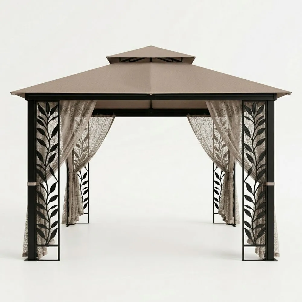Stahl-Pavillon mit Polyesterdach und Vorhängen, Beige/Schwarz